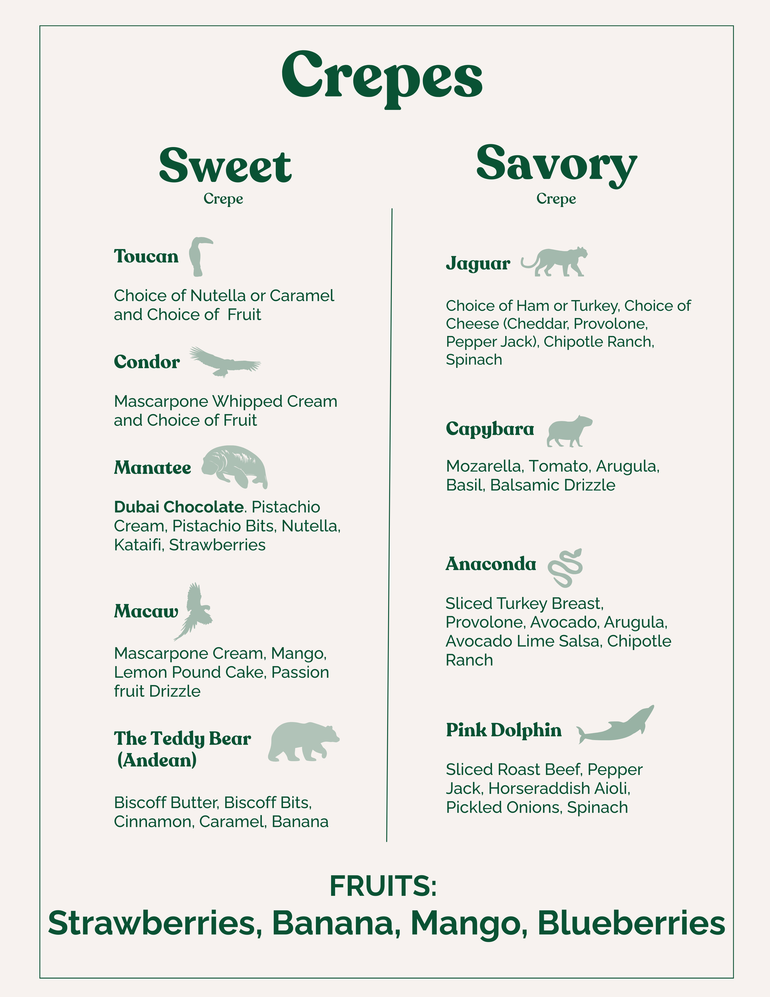 We’re Colombians bringing our passion and creativity, one crepe at a time. Our food trailer serves up delicious savory and sweet crepes, made fresh to order and packed with flavor. While our recipes aren’t traditional Colombian cuisine, our brand is rooted in the vibrant spirit of Colombia, especially the wild beauty and bold personality of its jungles.