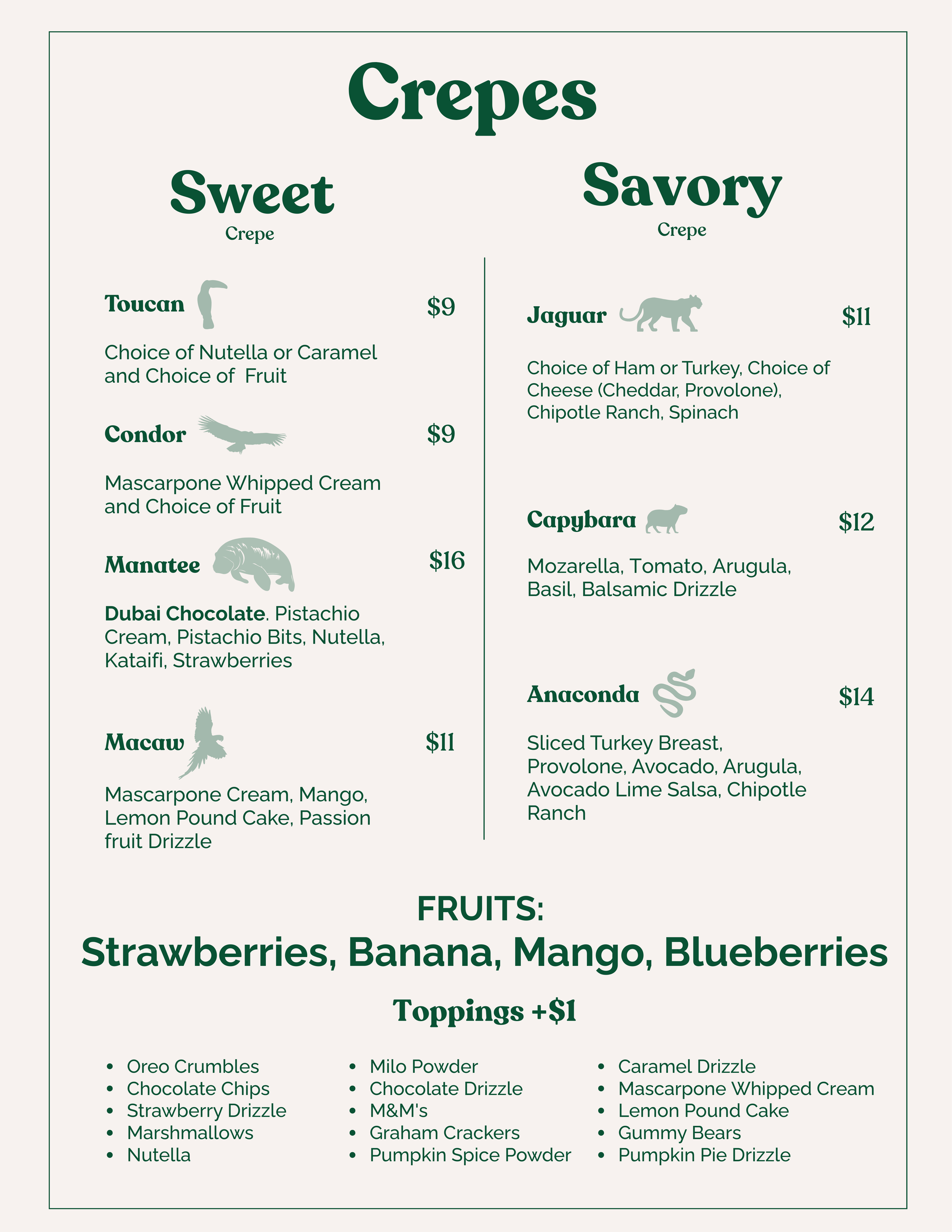 We’re Colombians bringing our passion and creativity, one crepe at a time. Our food trailer serves up delicious savory and sweet crepes, made fresh to order and packed with flavor. While our recipes aren’t traditional Colombian cuisine, our brand is rooted in the vibrant spirit of Colombia, especially the wild beauty and bold personality of its jungles.